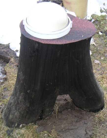 у меня участок рядом с лесом. Нашел в лесу дерево, пустое изнутри. И сдела вот такие светильники. Все провода внутри ))