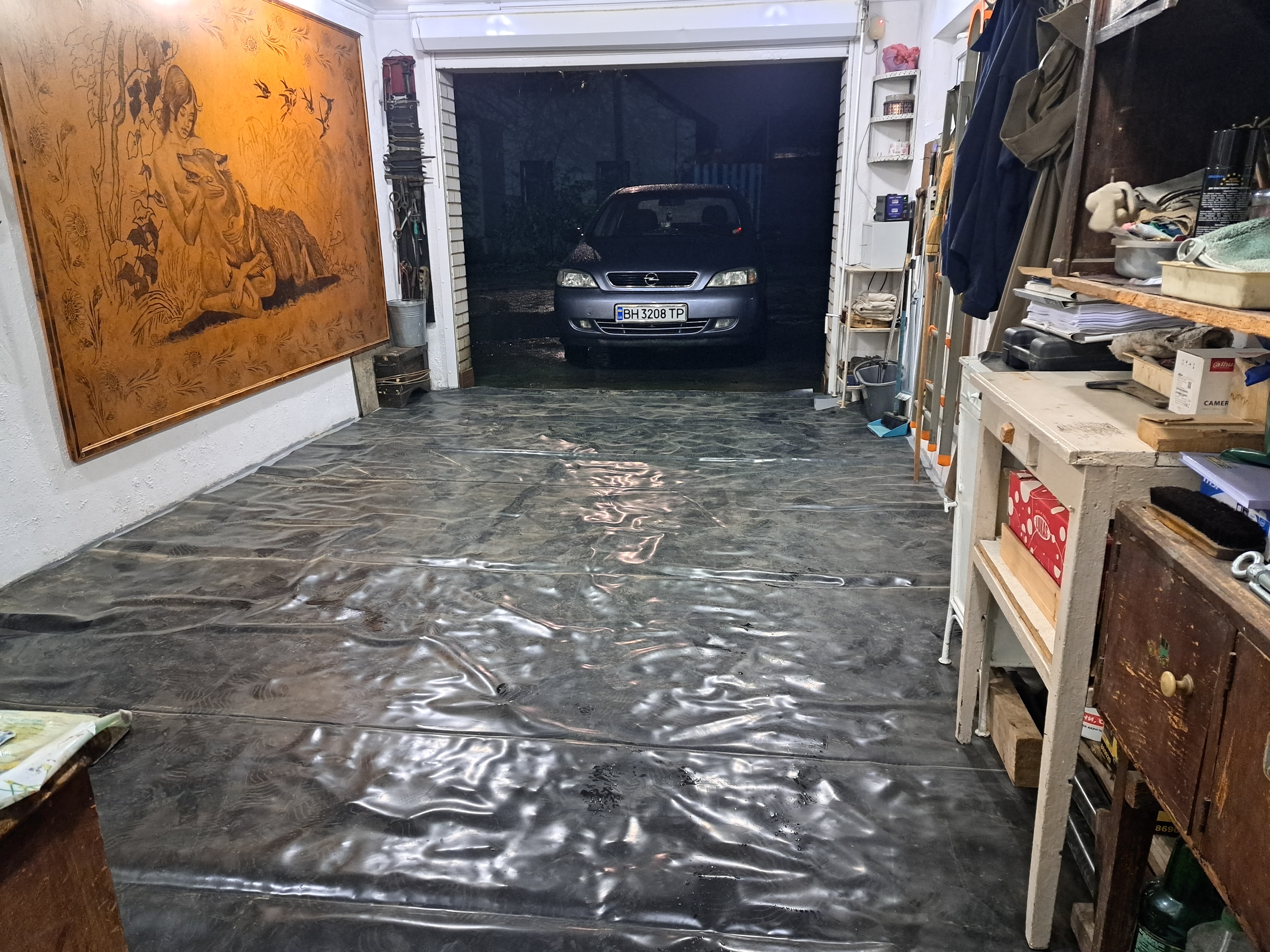 Который день идут дожди... Жена ругается на грязь в гараже, но продолжает мыть там пол. А сегодня подкинула идею - застелить чем-нибудь пол в гараже. Вообщем, в ход пошла пленка, которая валялась без дела на чердаке.