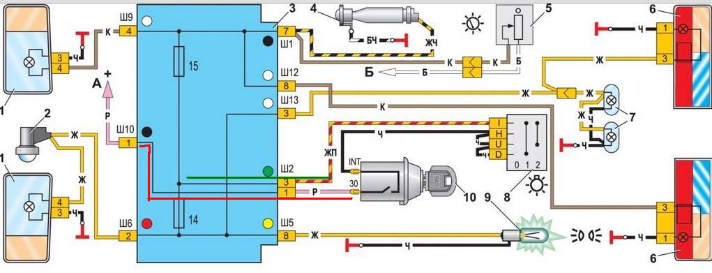 Elf575 При снятии кнопки габариты гасли? Если нет, то имеет место замыкание (смыкание) двух проводов: розового от замка зажигания (этот провод всегда под напряжением) до зелёной колодки Ш2/1 монтажного блока со стороны салона и жёлто - красного провода от этой же колодки Ш2/3 до выключателя наружного освещения (кнопки). Удачи в поиске "смычки"