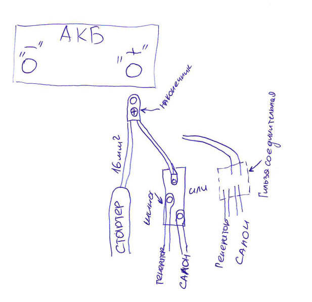 Как выяснил, к АКБ подходят следующие провода, ниже общая схема: