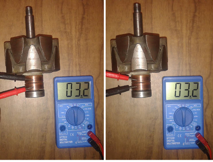 а) прикладывая щупы омметра к контактным кольцам ротора, проверяем обмотку возбуждения на отсутствие обрыва. Сопротивление исправной обмотки возбуждения должно быть 5-10 Ом;