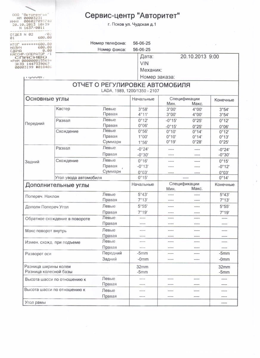 Л: п/болт 1 шайба 0,5; кастер 3°06'; развал -0°12'