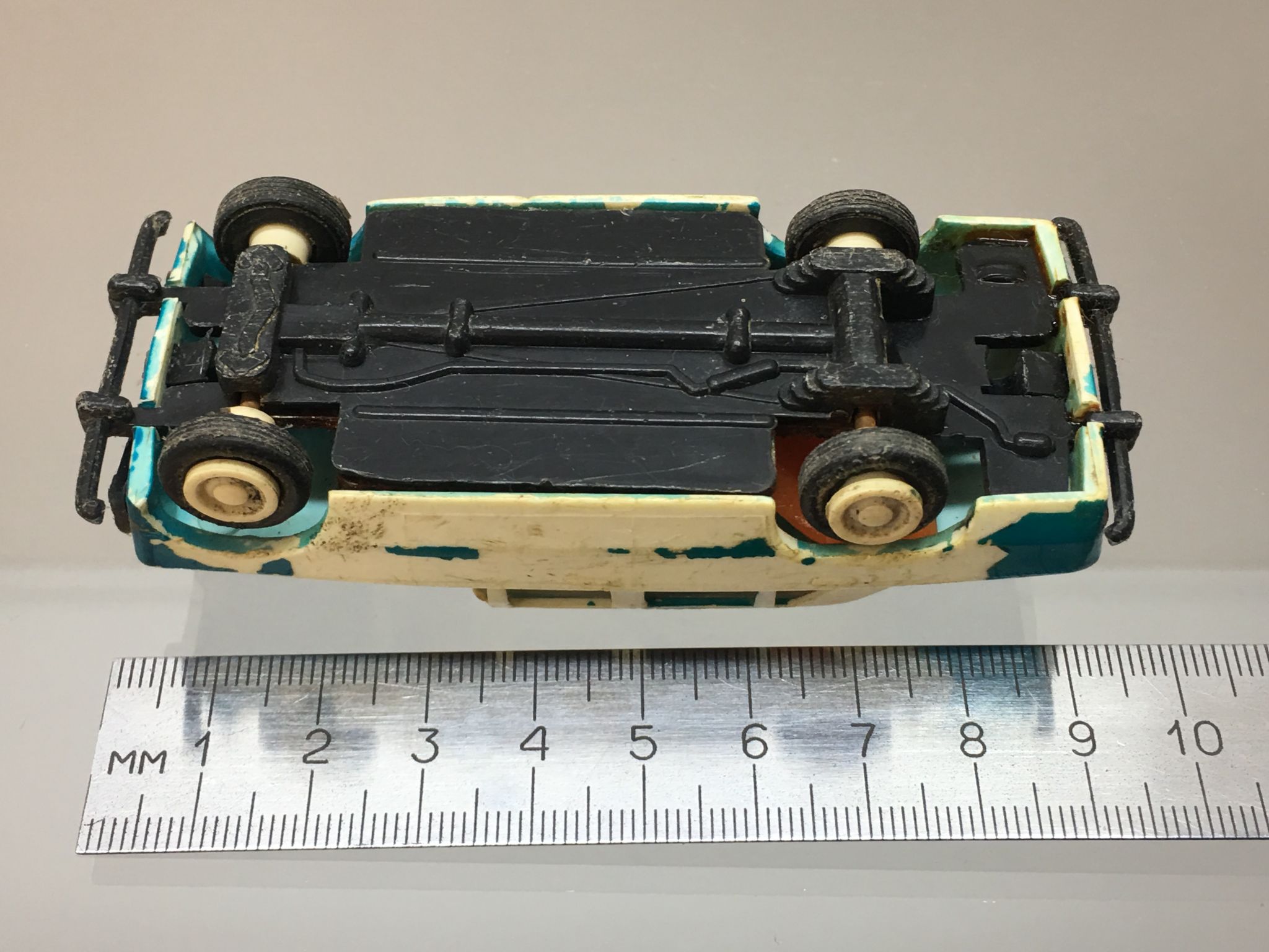 стекла фары нет, салон криво склеен, пассажирское сидение сломано. Зато в комплекте была рабочая мигалка с сиреной и моторчик. Сирену снял, стекло вырезал.