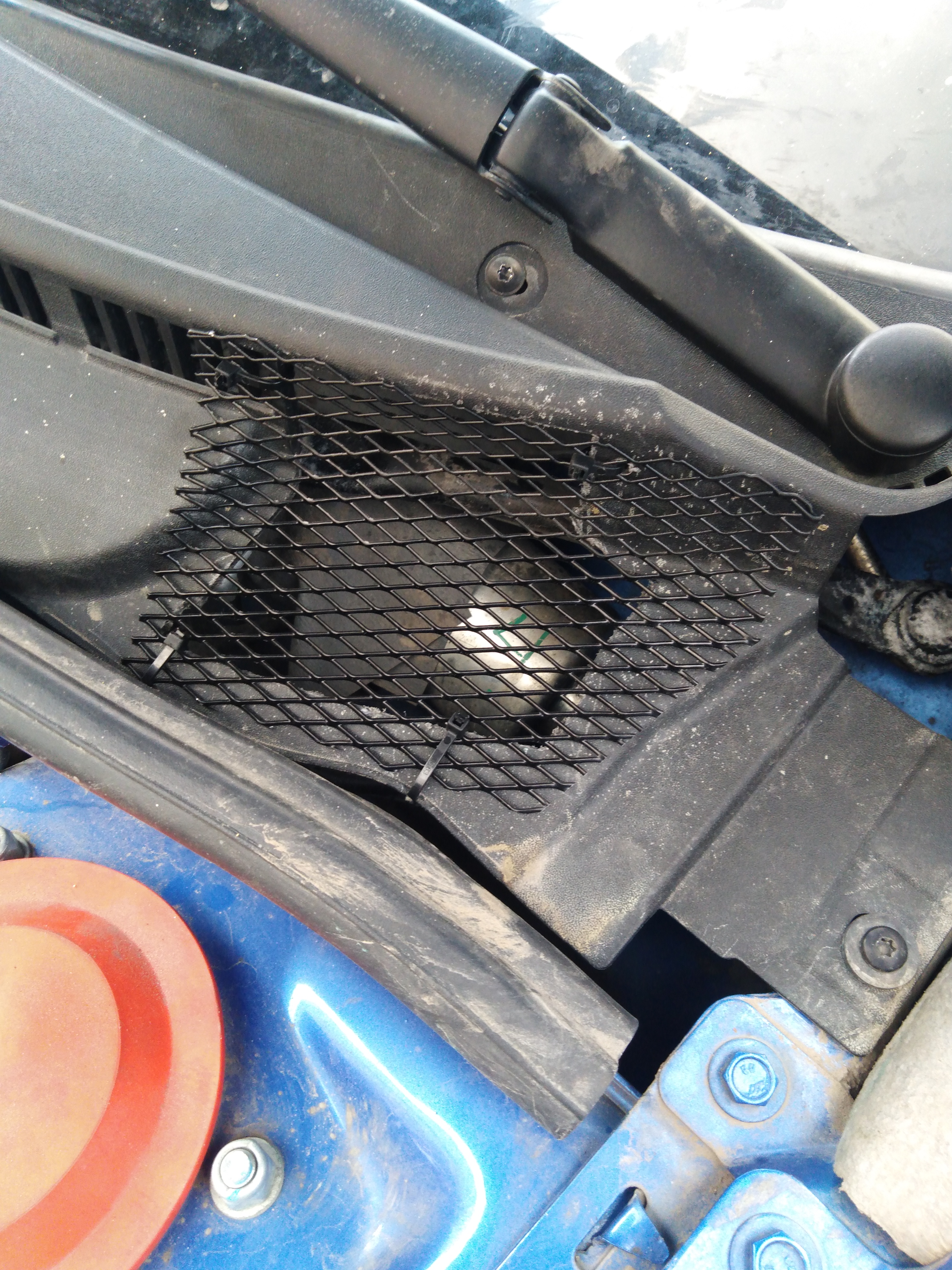 В обновленной гранте измененное жабо, добраться до стока в районе моторчика стеклоочистителя можно только сняв поводки, только потом жабо. За 8 месяцев там накопилась горсть листвы и грязи, забив сток. Выпилил окошко, на стяжки сетку, теперь можно, убрав сетку, залезть рукой и все почистить быстро и не дергая поводки стеклоочистителей.