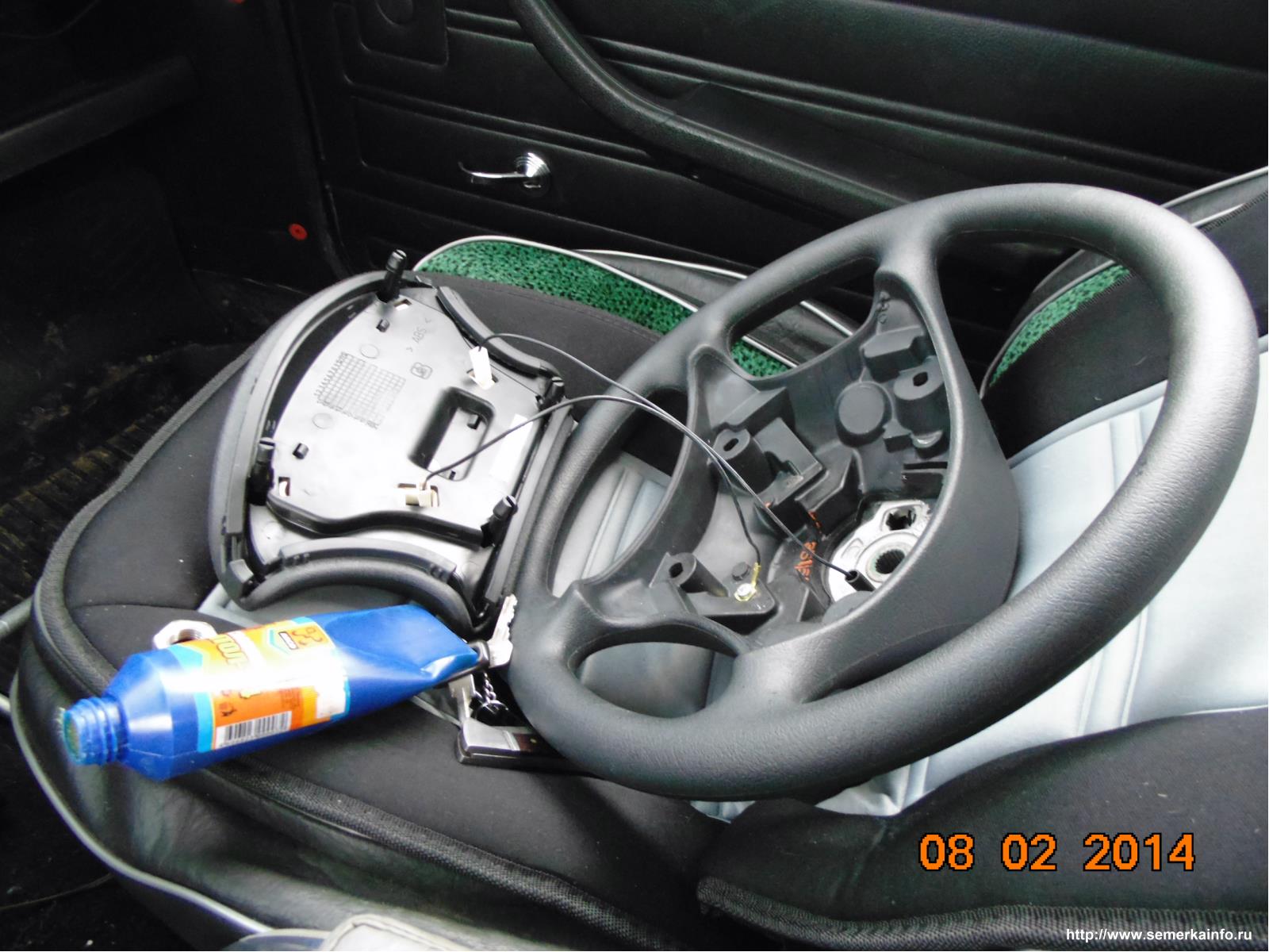 Шаг первый. Рулевое колесо родное снято. Второй шаг. Увидев ржавчину, и чтобы впоследствии не особо переживать о состоянии агрегатов, обработал вал Литолом. Новый руль подготовлен к установке заранее. Подсоединены все провода, для чего была проведена неполная его разборка. В ходе разборки было замечены недостатки - в двух местах обнаружены "пузыри" на пластиковом покрытии. Думаю, что сейчас это не новость, ибо запчасти нынче не айс!