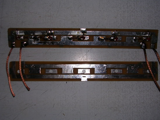 Разметив ,и просверлив в платах отверстия, под обычные советские светодиоды диаметром 5 мм, нарисовал нитрокраской дорожки и протравил в хлорном железа платы…