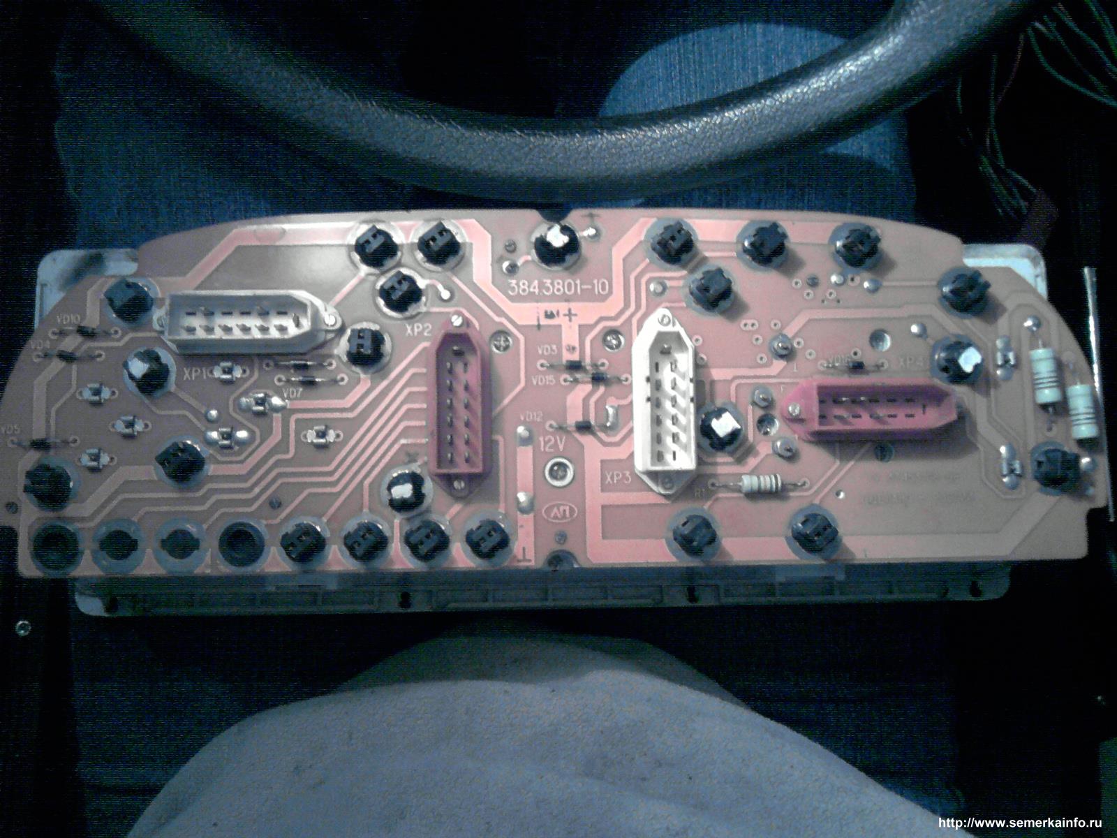 Ребята,с датчиком бензина разобрался, но вот тахометр при заведенном двигателе скачет от 0 до 2000 т/об ,как лечить. Надо знать какой точно номер (модель) тахометра,приборка с зади так выглядит (384.3801-10),машина карбовая,тахометр от катушки.