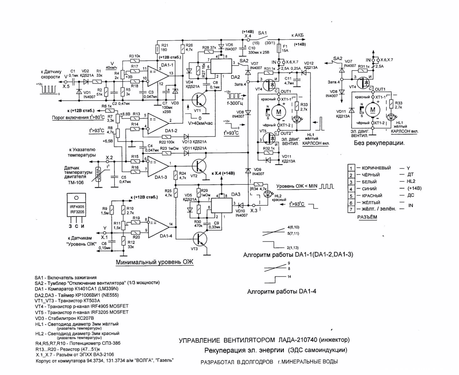 При скорости более 40 км/ч напряжение на неинвертирующем входе компаратора больше, чем на инвертирующем. На его выходе установится высокий уровень напряжения. Таймер будет обесточен и на его выходе также установится высокий уровень напряжения, транзистор VT1 закроется. ЭДВ перестанет вращаться, но для продувки радиатора охлаждения, чтобы двигатель автомобиля не перегревался, как уже сказано выше, будет достаточно встречного потока воздуха.