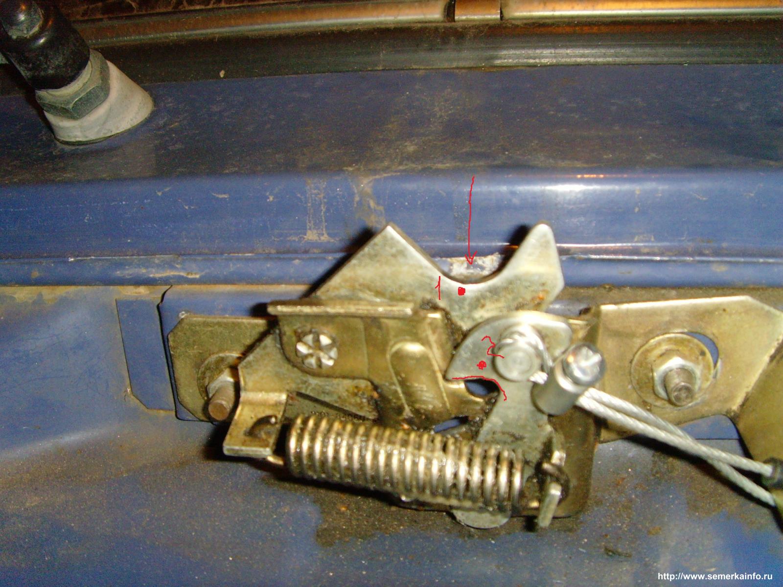 Штука два в этом положении блокирует поднятие крюка и открывание капота. Все просто. Но что может мешать, если штука 2 на полпути клинит?