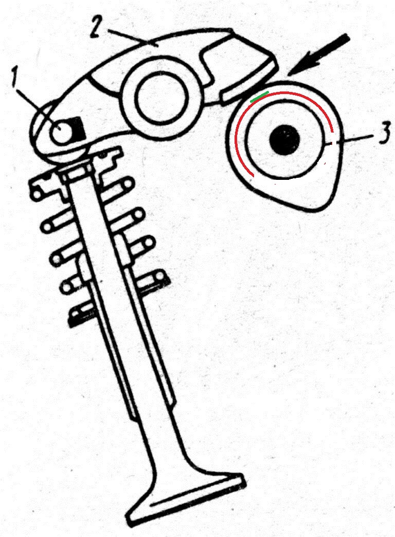 Поясняю. При равномерном износе цилиндрической части кулачка РВ возможна регулировка теплового зазора в любом положении, отмеченном красным - зазор будет постоянен. По букварю регулировка производится в зелёном (тыльном) положении кулачка.