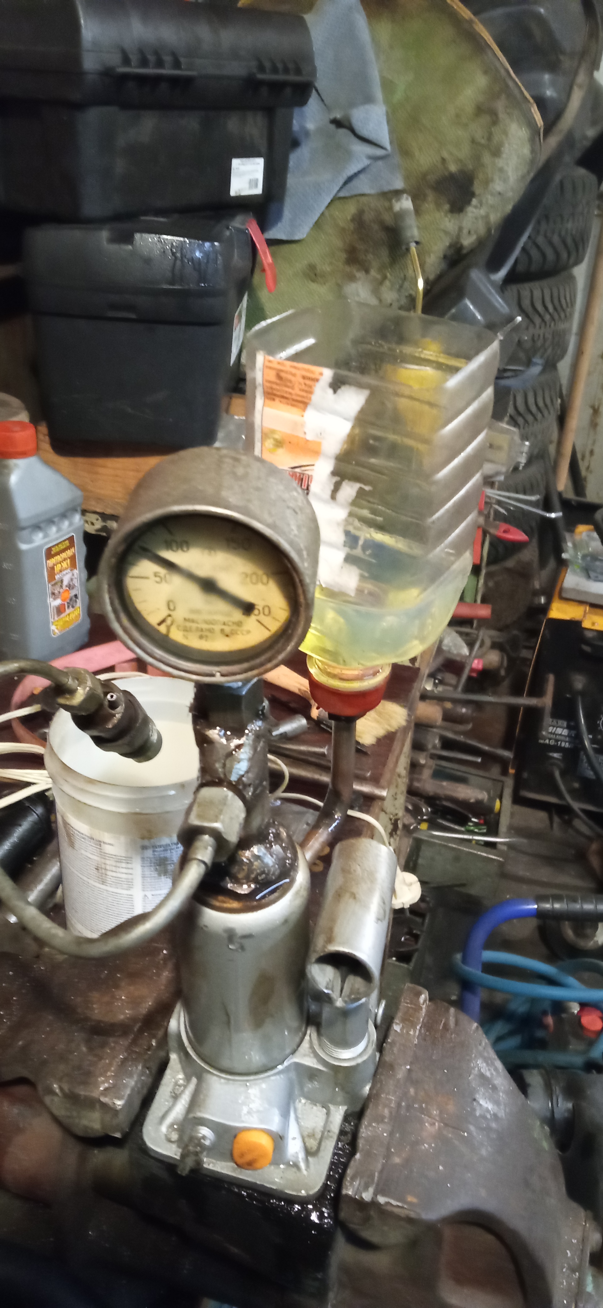 Давно ничего не писал. Наконец то сделал стенд для проверки форсунок из бутылочного гидравлического домкрата. Для контроля давления взял манометр на 250кгс/см², шток просверлен, винт убрал, вварил гайку под манометр и штуцер под топливную трубку Марсика. В общем результат: из трех резервных форсунок живая одна: сработала при 115кгс/см² и распыл есть. остальные сработали при 160 и 180, распыл правда туман.