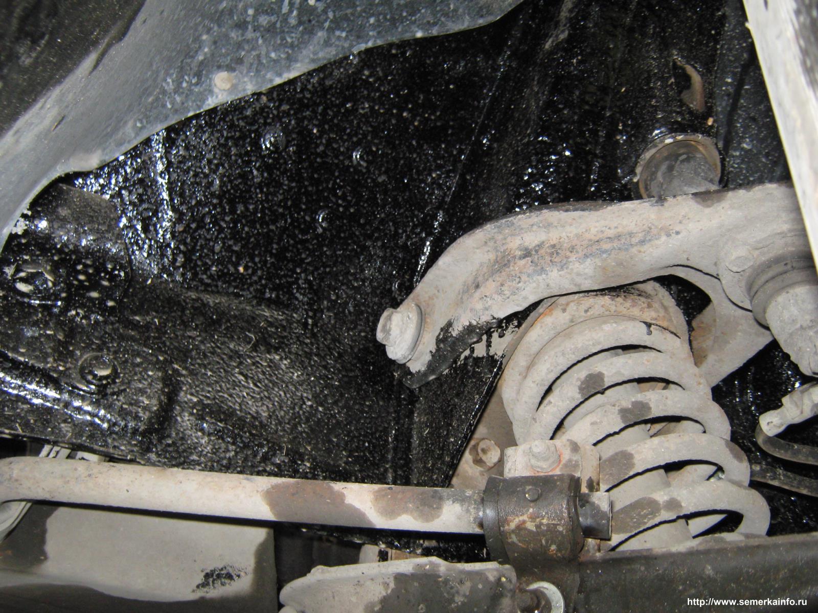 Обработка кузова. Дальше порогов лезть не стал, т.к. там антикор держится еще хорошо. Снял передние подкрылки. Покрытие было в идеале. Ну все равно обновил. Задние трогать не стал.