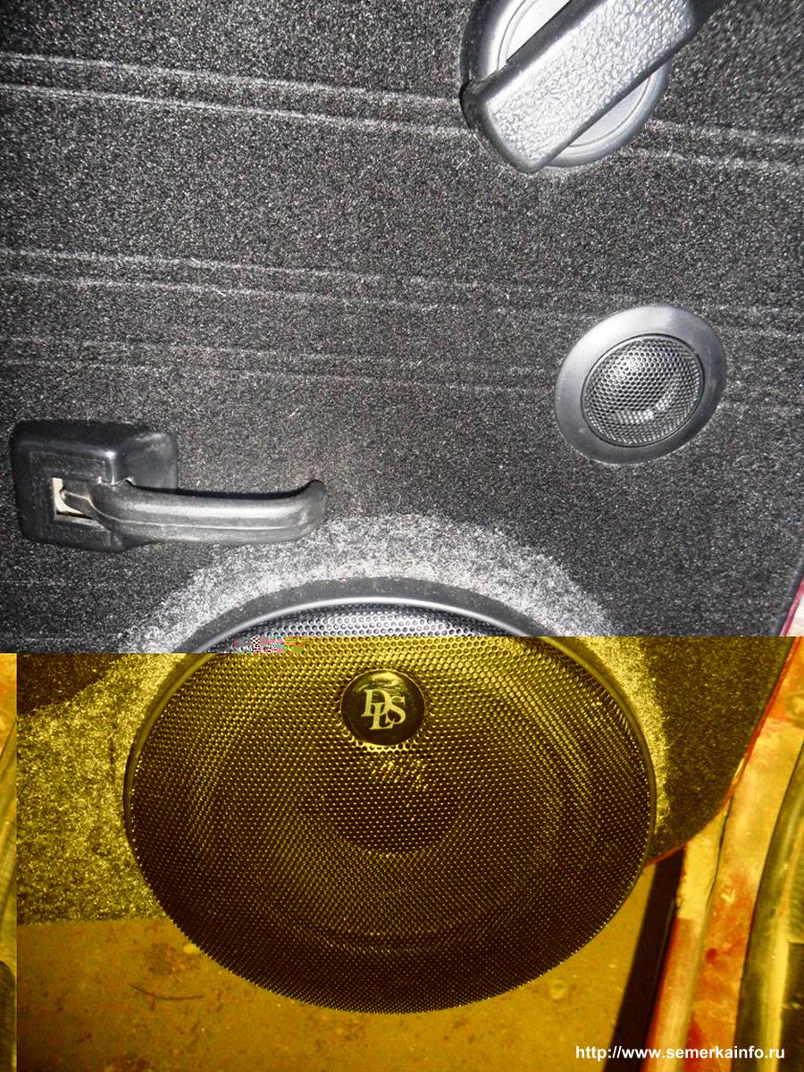 Я засверливался в дверь и там где крыло крепится, туда. Но перед этим снимал маленькую драпировку(боковушки ног). Они крепятся 2-мя пистонами, которые очень трудно вытащить, пришлось их срезать ножом, а остатки утапливать вовнутрь крыла, друган говорит они продаются и стоят гроши. В просверленые отрверстия просовываем проводку, у меня там провода от колонки и от электрозамка двери, и затем надеваем ни них кембрик. Ставим боковушку ног обратно, потом обшивку двери, прикручиваем подиум саморезами в просверленных местах, подключаем колонку и саморезим ее к подиуму. Вроде все.