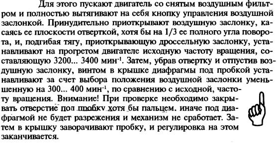 а дальше закрываеш пробку корпуса диафрагмы пускового устройства пальцем и обороты должны упасть на 300 - 400 (то есть где то 2800 - 3000) при необходимости регулируешь зазор воздушной заслонки.