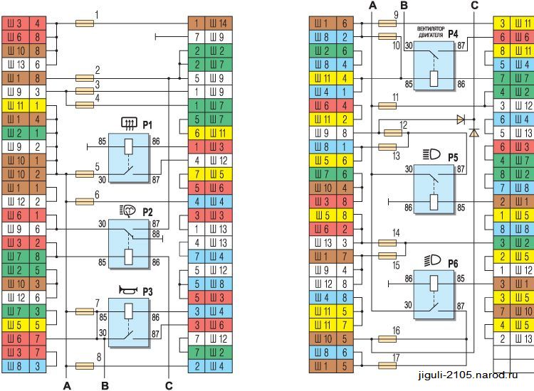 В ЧЯ (монтажный блок) на контакте 85 всегда имеется +12 В, они приходят от колодки Ш10.1 через предохранитель №7 (рис. 1). На Ш10.1 приходит розовый провод от гены и АКБ (рис. 2). Дорожка в ЧЯ меду контактами реле 85 и 30 (рис. 1) обеспечивает постоянные +12 В на клемме 30 реле Р3. От клеммы 30 реле Р3 идет дорожка к колодке Ш6.7 (рис. 1), а из колодки Ш6.7 выходит красный провод и идет в гудкам фа-фа (рис. 2), т.к. на клемме 30 реле Р3 имеется постоянные +12 В, то и на конце красного провода всегда будут иметься постоянные +12 В. Эти постоянные +12 В в твоих купленных гудках не нужны, поэтому этот провод изолируем.